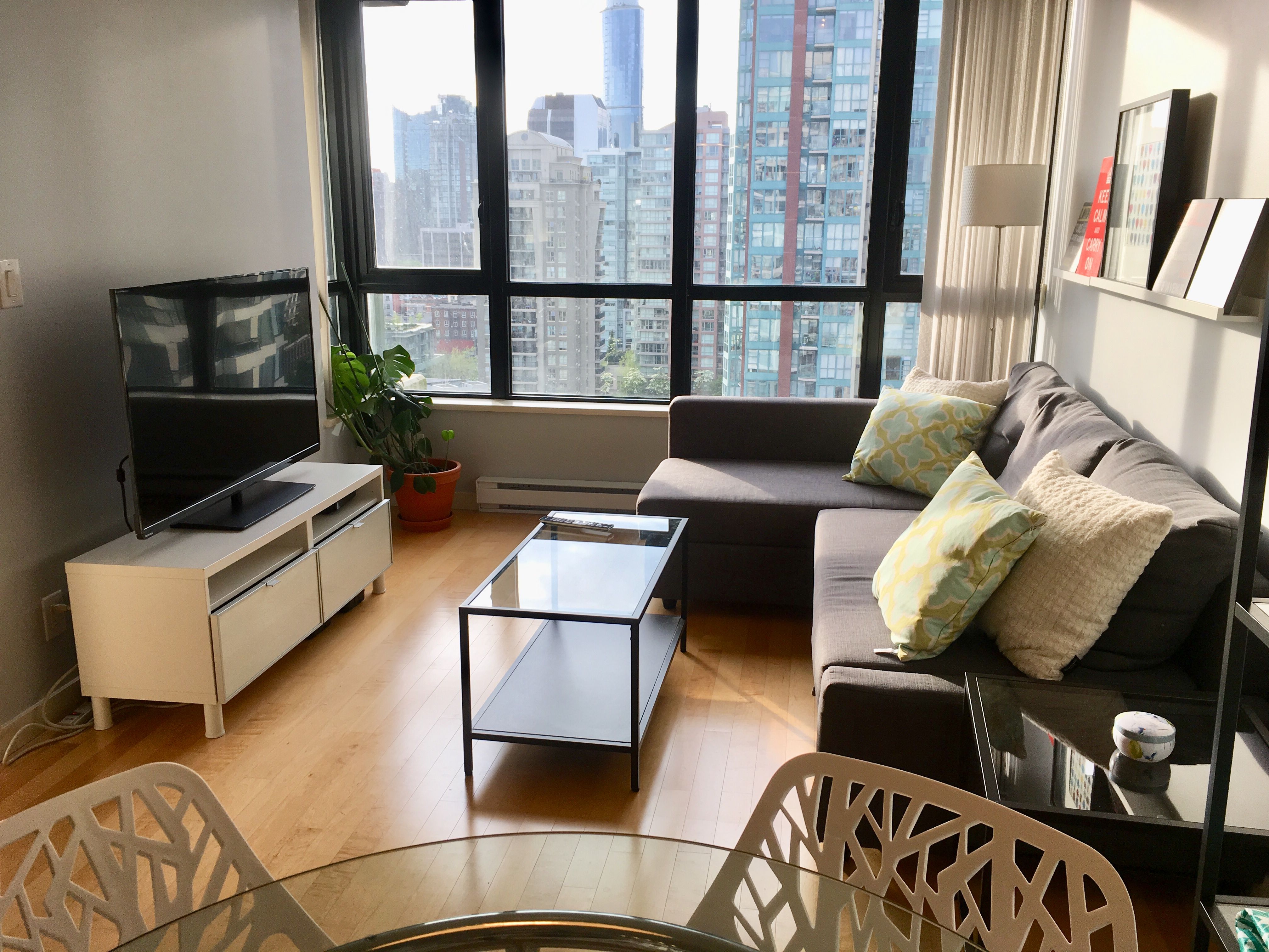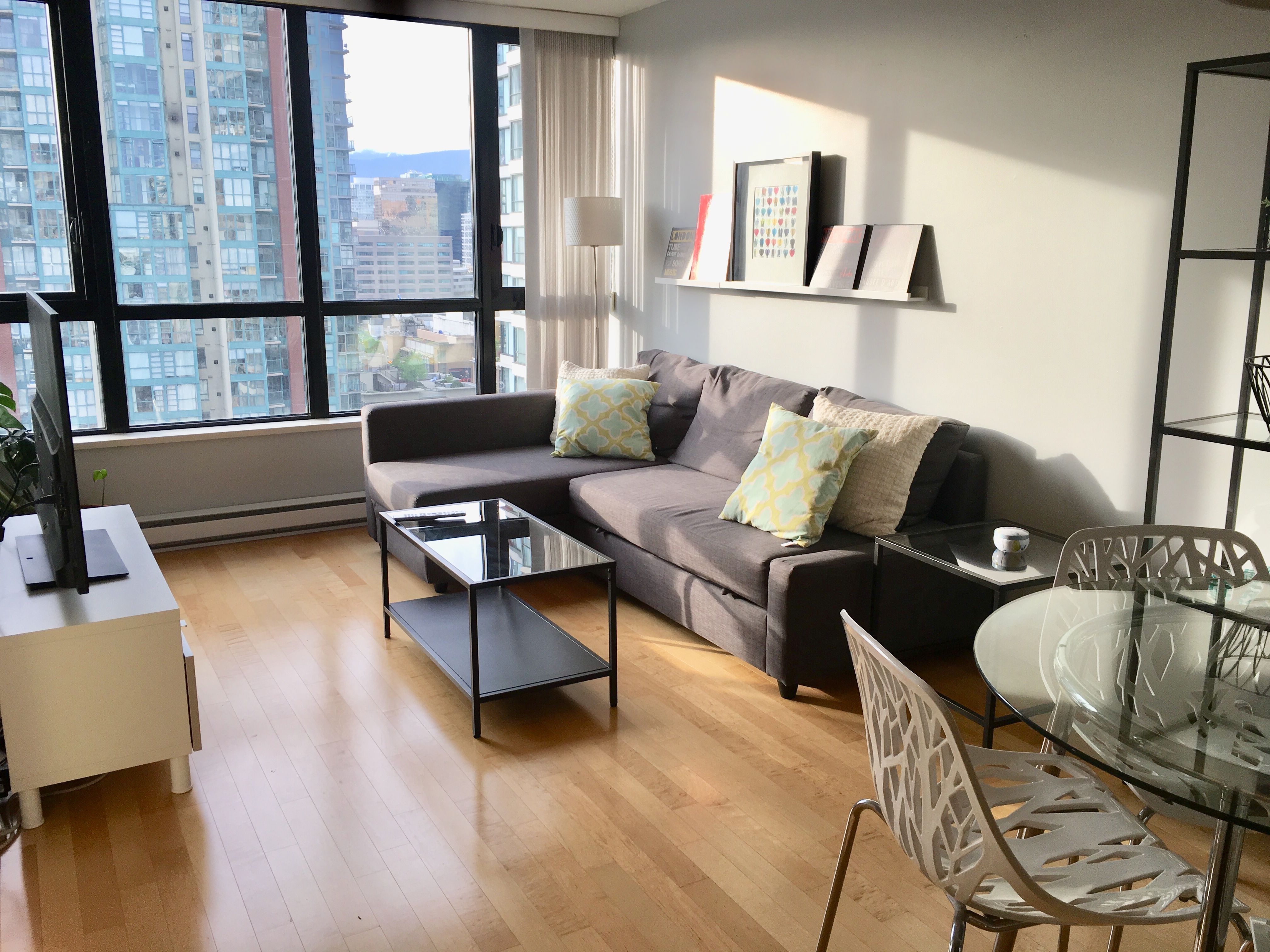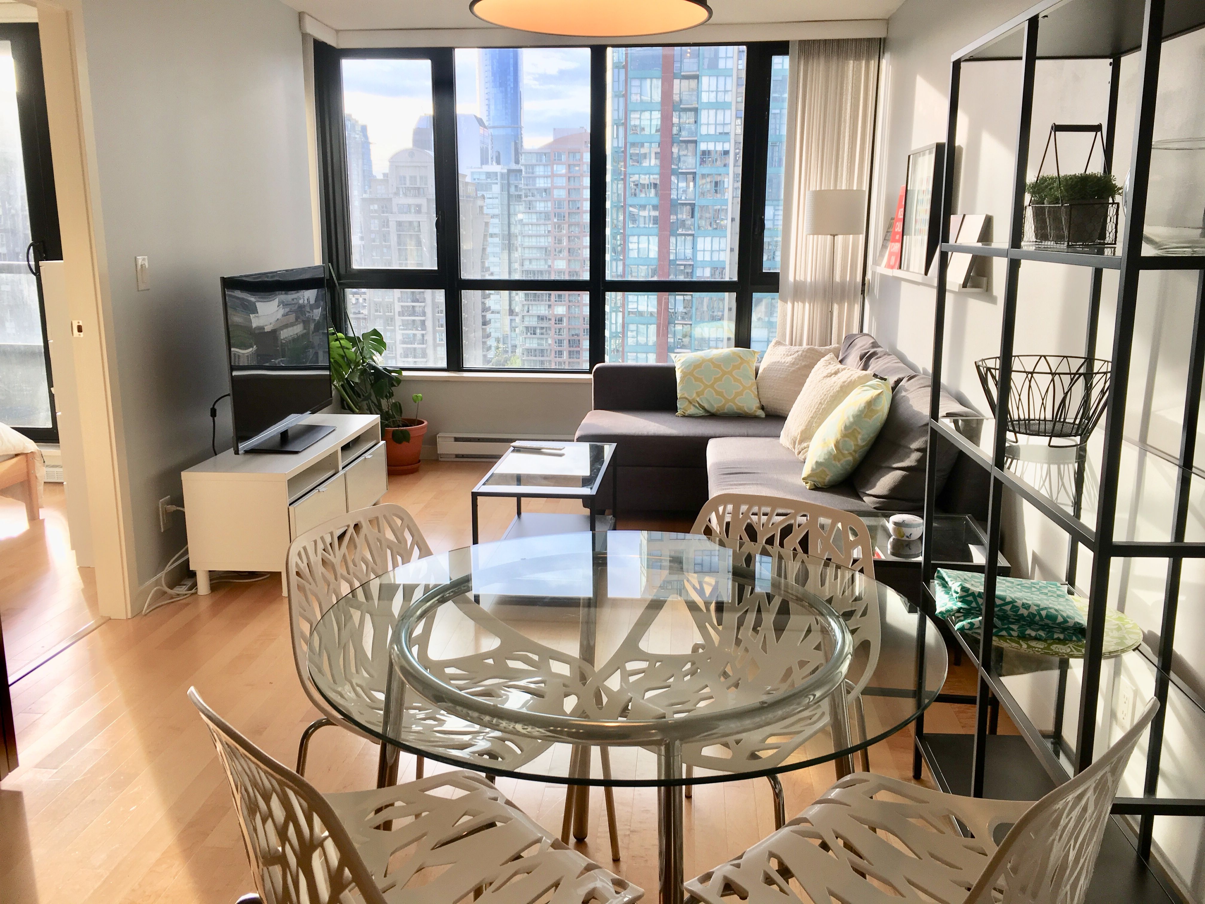 FULLY FURNISHED 1 BR & Den upper unit on 23rd floor in sought-after Yaletown Park featuring sweeping city skyline views, 583 sq ft of living space, hardwood floors, in suite laundry. Situated in the heart of Yaletown, steps to the city's most sought after dining establishments, cafe's, markets & boutiques, as well as marina, seawall, community centre, skytrain & transit.