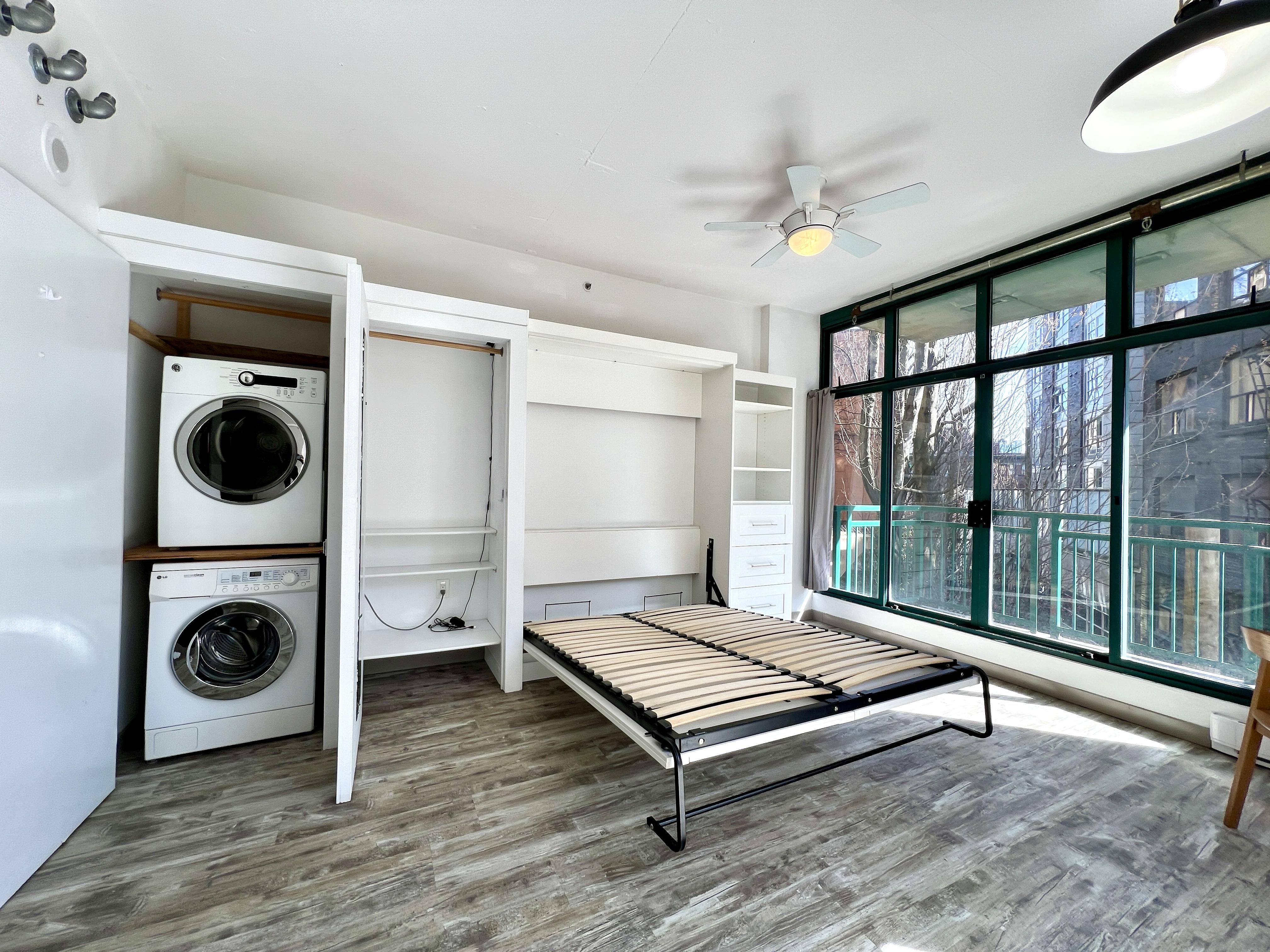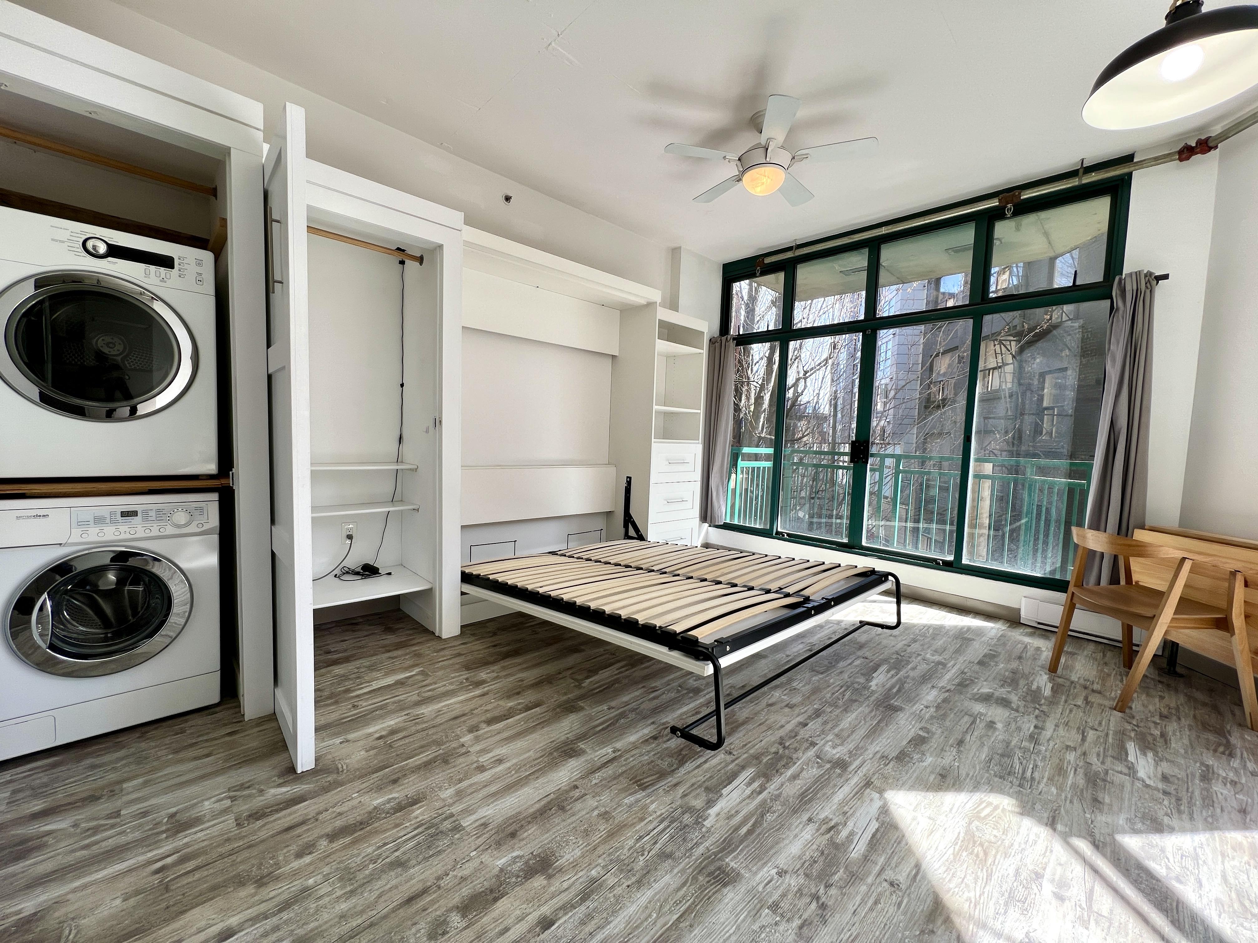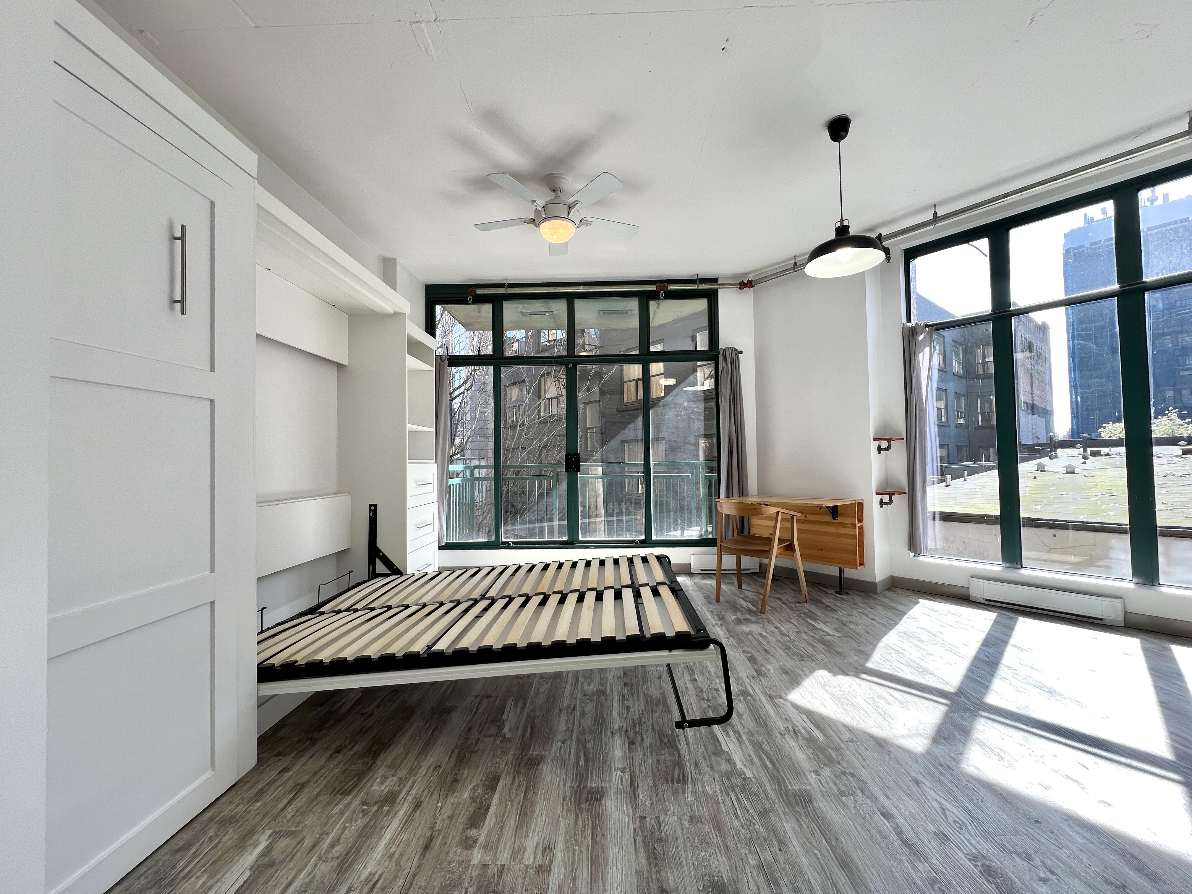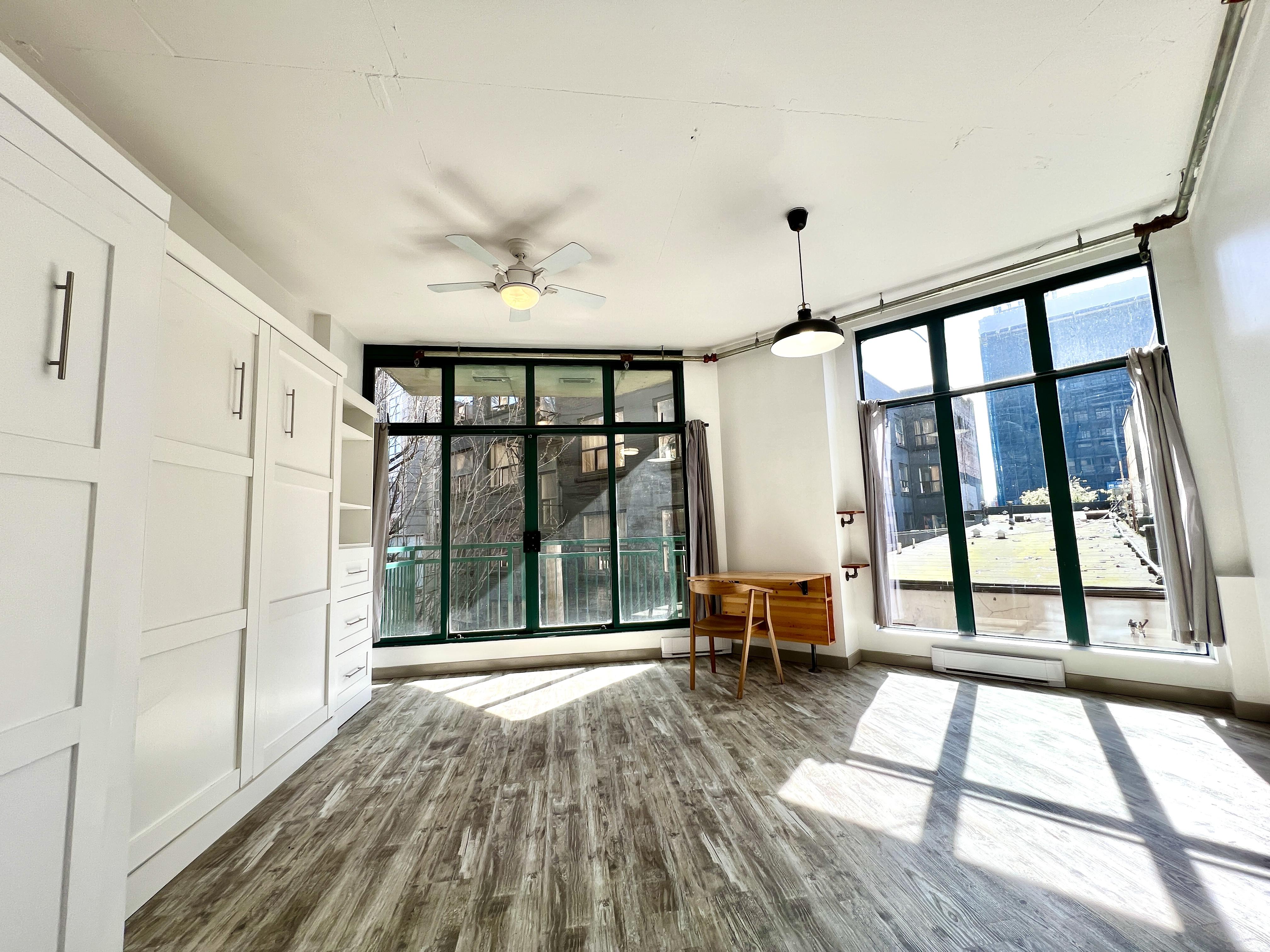 Functional and renovated GASTOWN STUDIO featuring laminate flooring, built in storage and murphy bed in the Van Horne Building. Spacious balcony (BBQ allowed) overlooking a quiet treed courtyard. Corner unit with sunlight all day pouring in through the south facing floor to ceiling windows and east facing double patio doors. Functional lay out that allows for a spacious living/working area during the day and quickly converts to a bedroom at night. Kitchen and bathroom were recently renovated.