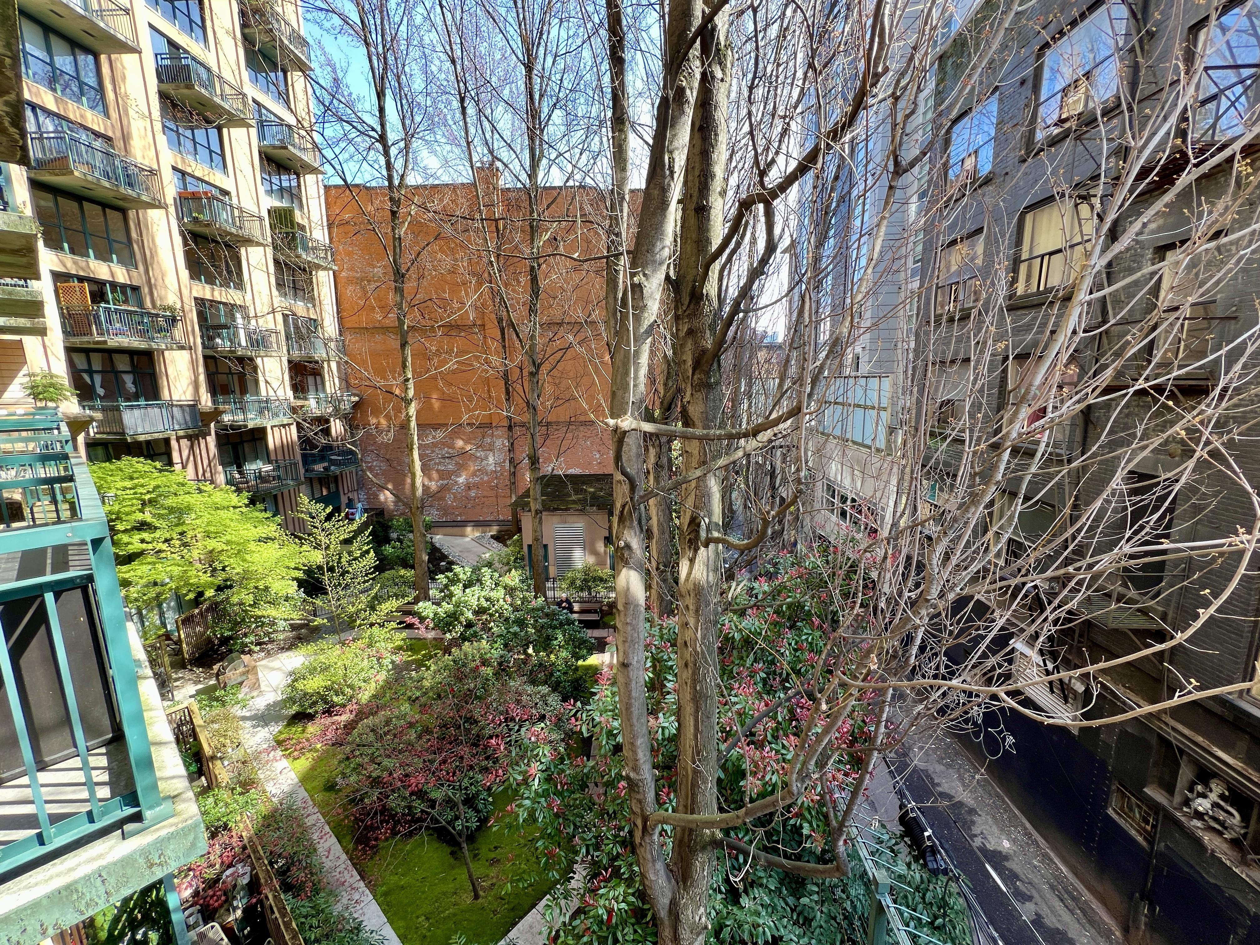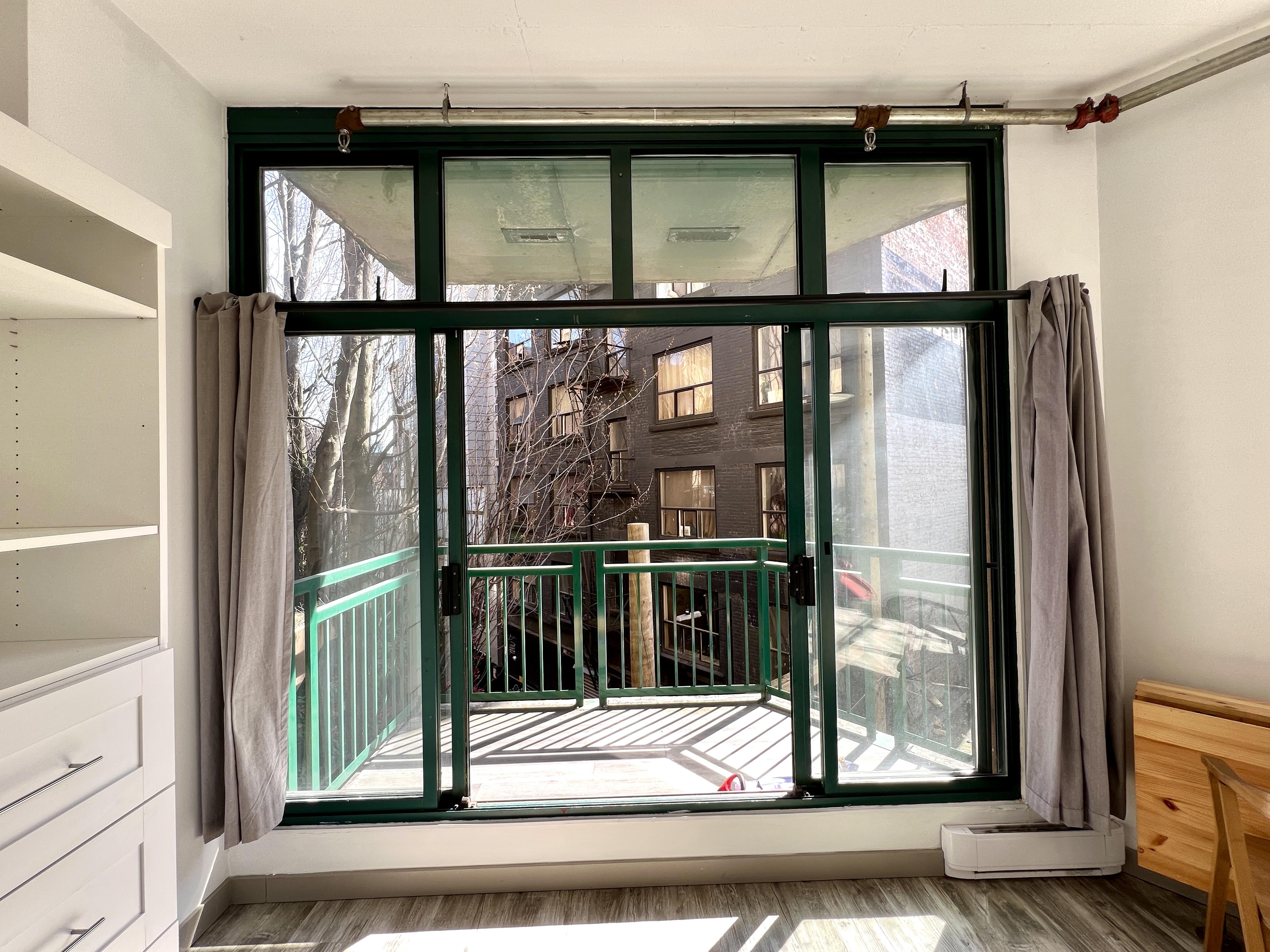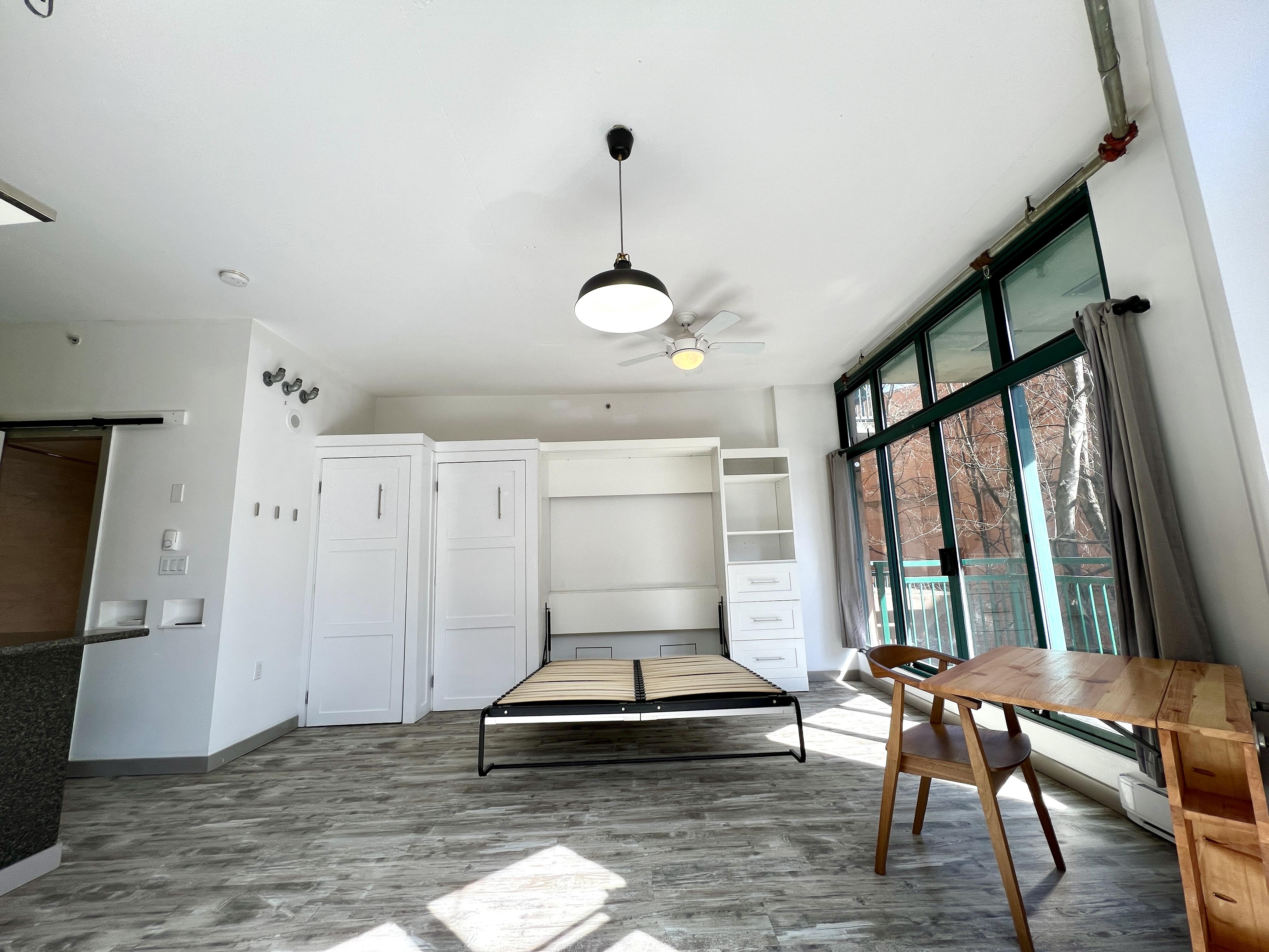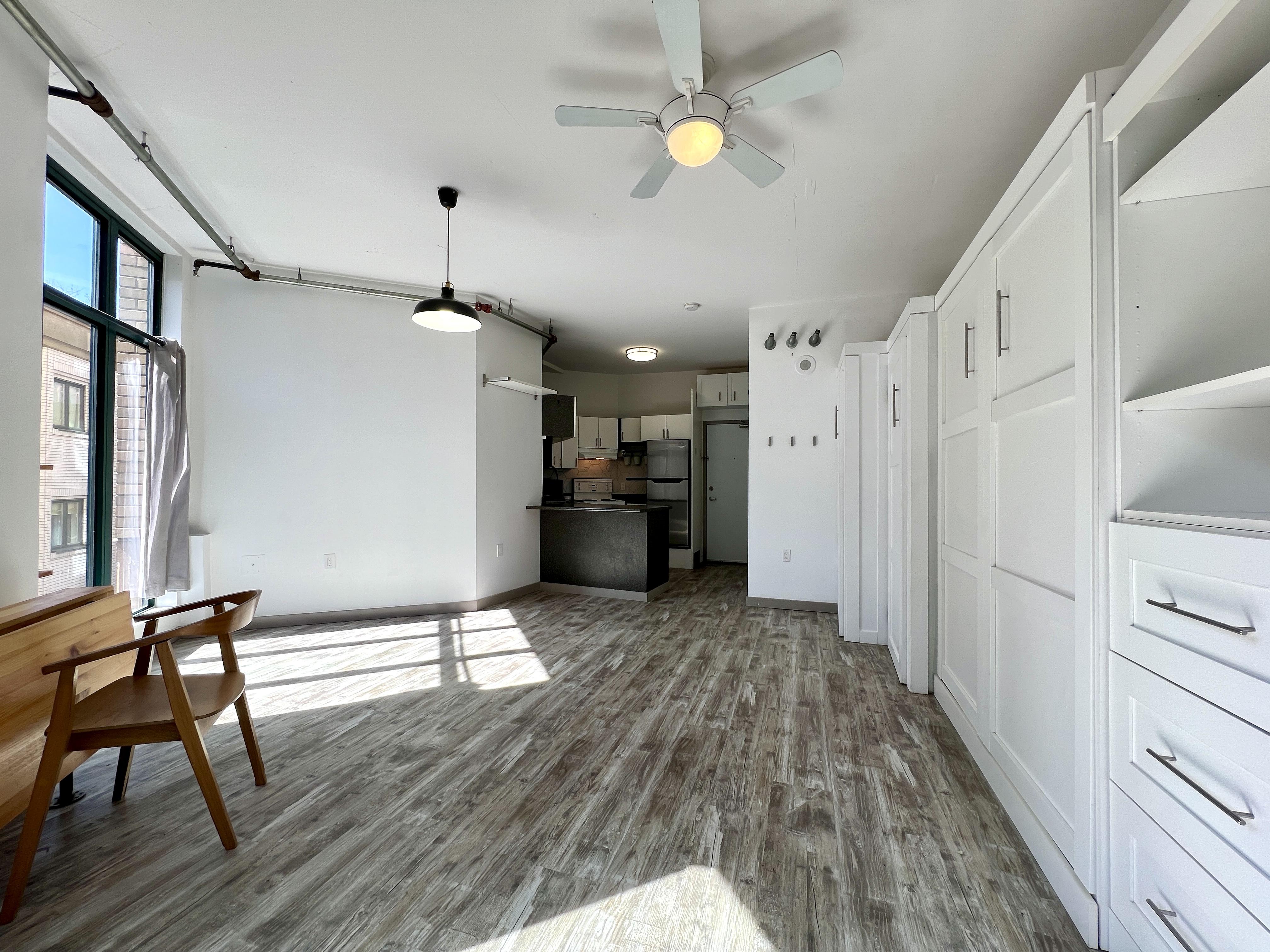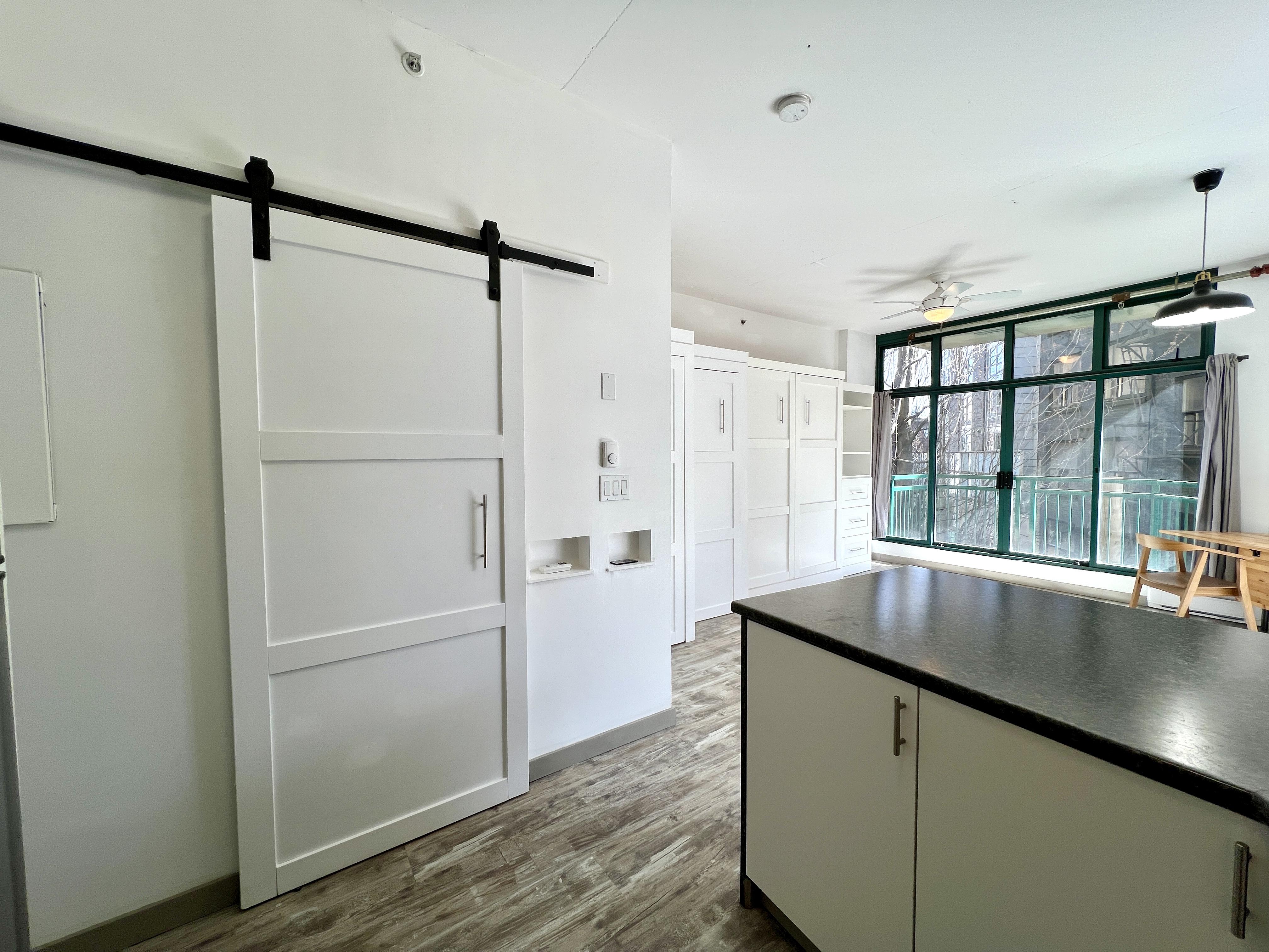 Functional and renovated GASTOWN STUDIO featuring laminate flooring, built in storage and murphy bed in the Van Horne Building. Spacious balcony (BBQ allowed) overlooking a quiet treed courtyard. Corner unit with sunlight all day pouring in through the south facing floor to ceiling windows and east facing double patio doors. Functional lay out that allows for a spacious living/working area during the day and quickly converts to a bedroom at night. Kitchen and bathroom were recently renovated.
