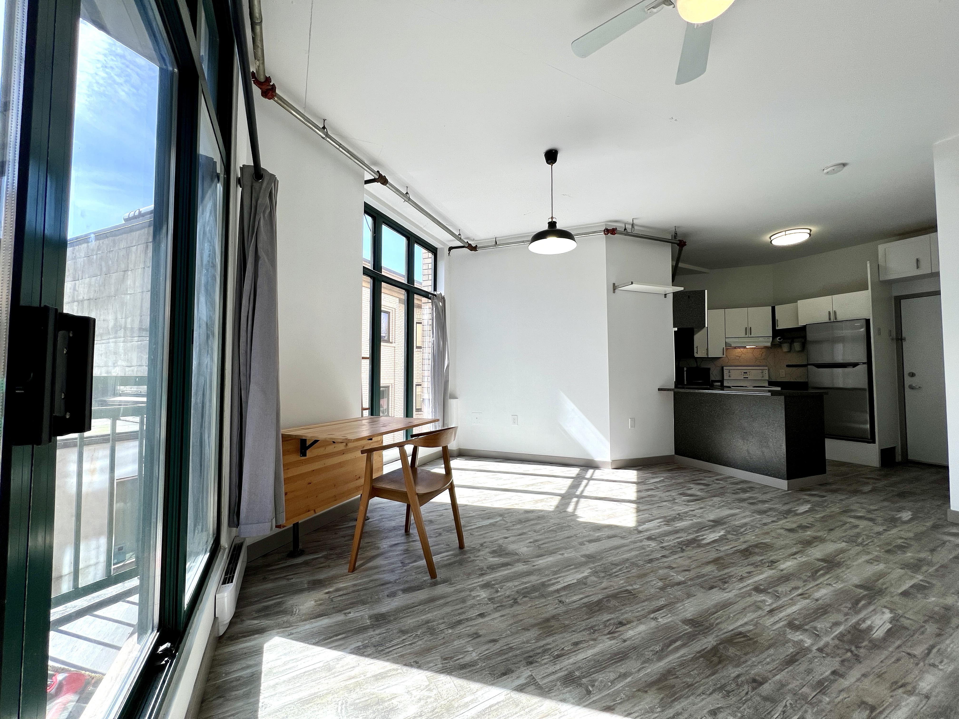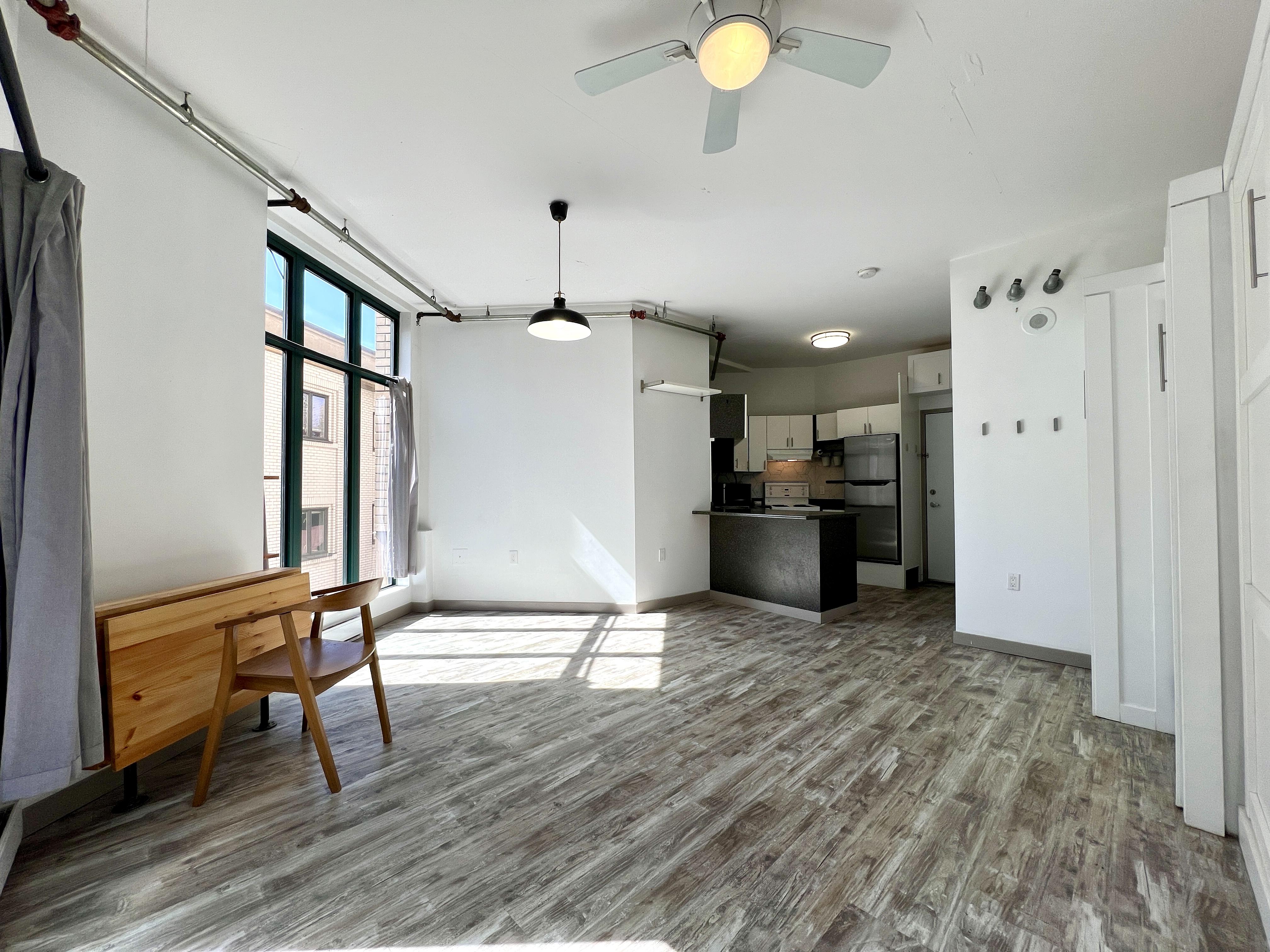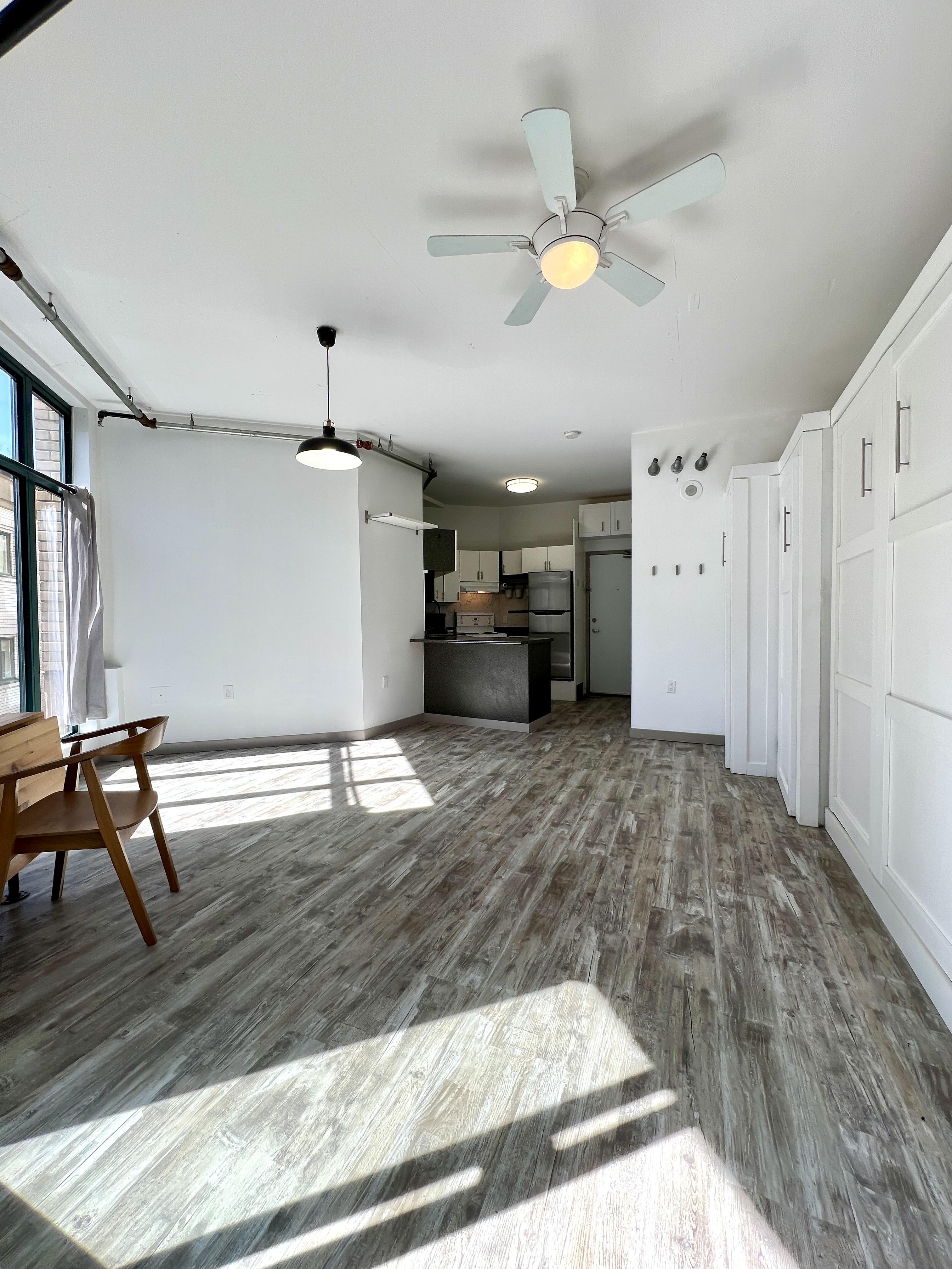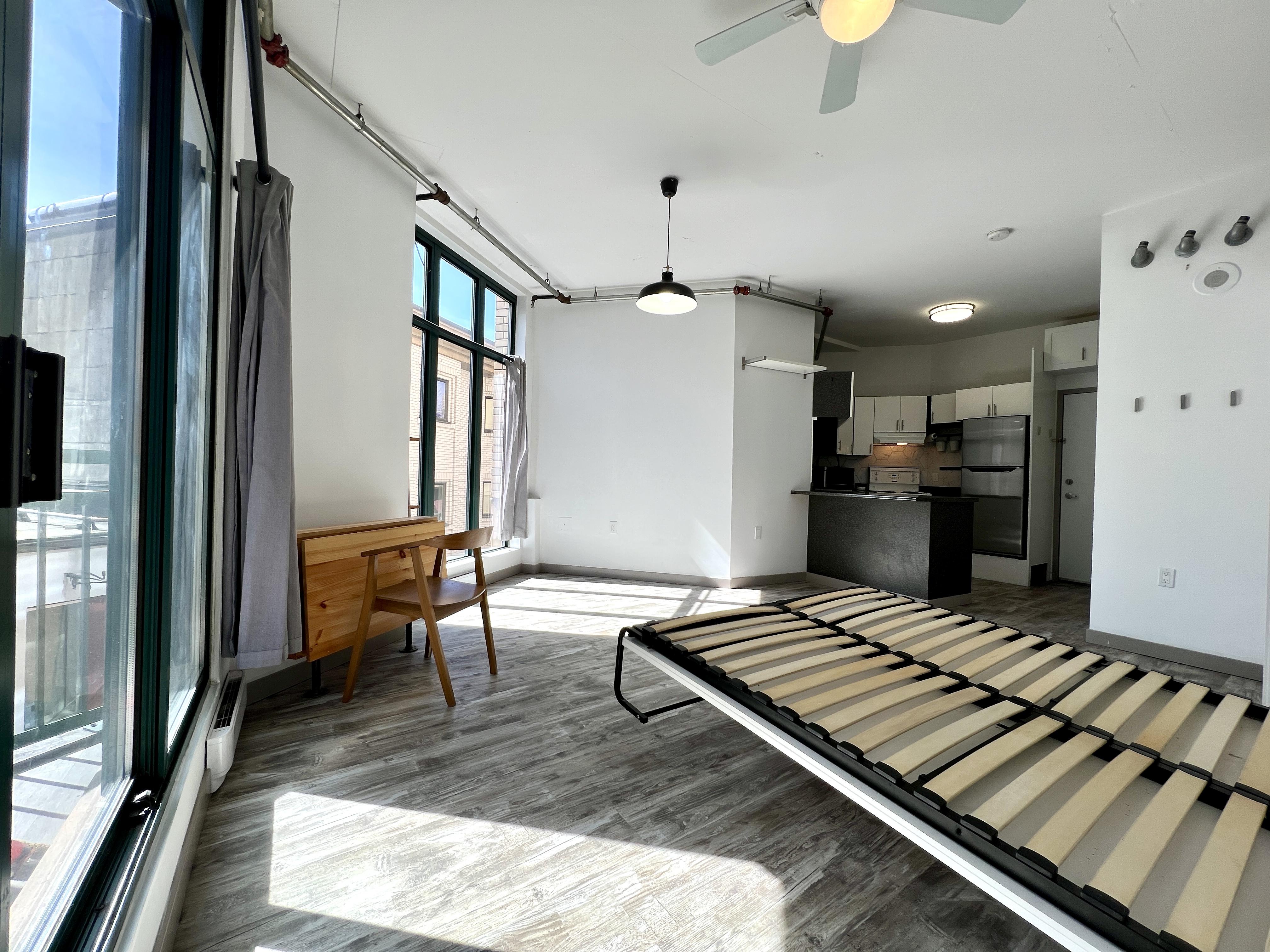Functional and renovated GASTOWN STUDIO featuring laminate flooring, built in storage and murphy bed in the Van Horne Building. Spacious balcony (BBQ allowed) overlooking a quiet treed courtyard. Corner unit with sunlight all day pouring in through the south facing floor to ceiling windows and east facing double patio doors. Functional lay out that allows for a spacious living/working area during the day and quickly converts to a bedroom at night. Kitchen and bathroom were recently renovated.