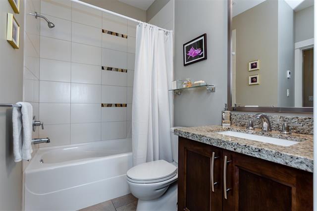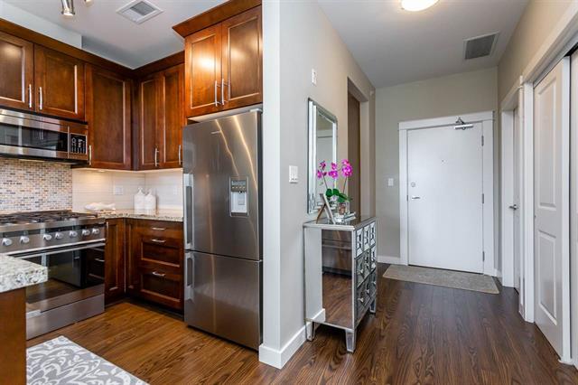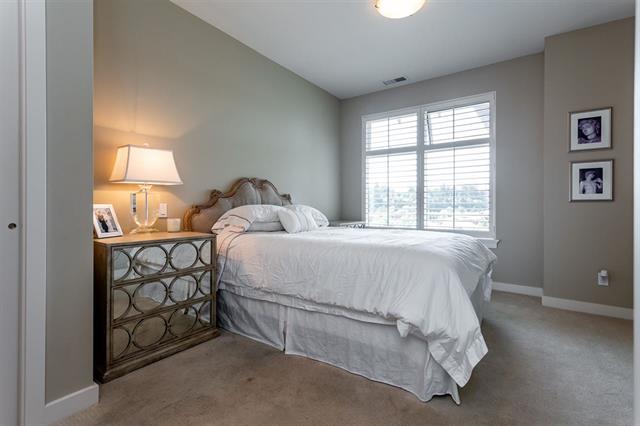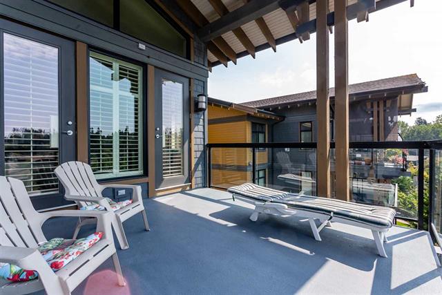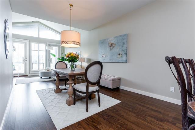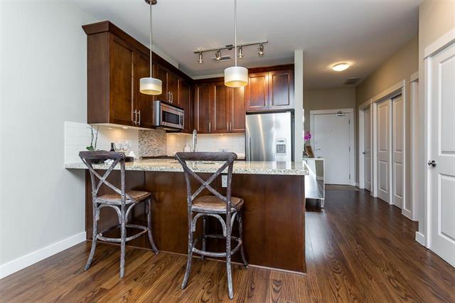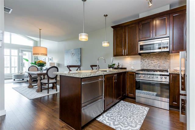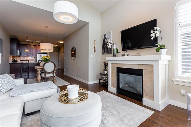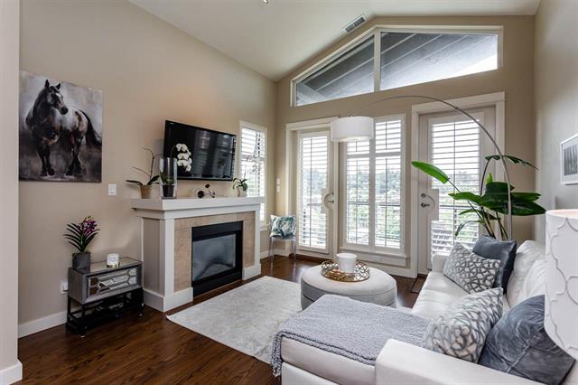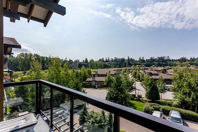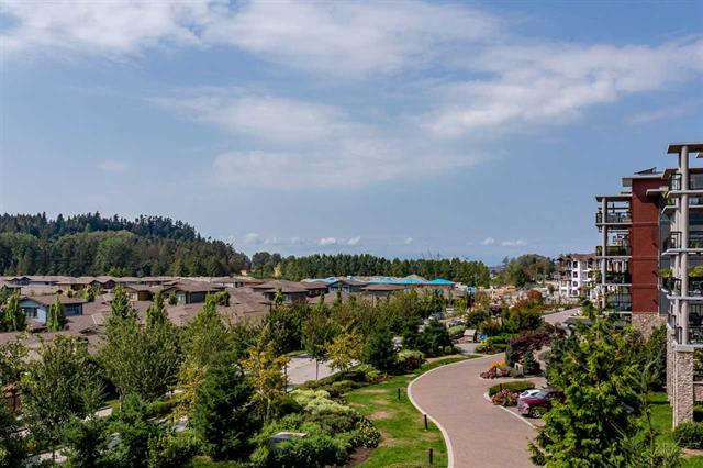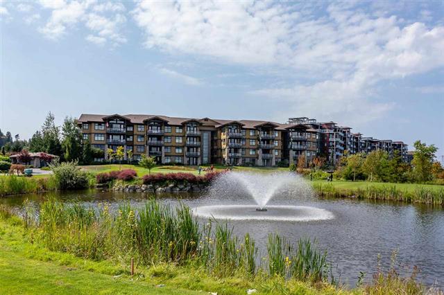 Resort-style golf course living at this PENTHOUSE LEVEL 1 BR & Den in master-planned TSAWWASSEN SPRINGS! This meticulously maintained home features custom California Shutters, soaring 11' vaulted ceilings, high end S/S Fisher & Paykel appliances, double drawer dishwasher, granite counters, undermount sink, gas range, front loading Samsung washer/dryer, cozy gas fireplace. Enjoy sunset views from the oversized 175 sqft sunny southwest facing patio with golf course & peek-a-boo ocean views, & gas hookup for BBQ & outdoor heater. Geo-exchange heating & AIR CONDITIONING, & Nu-Heat heated ensuite floors. 2 PARKING - one has electric car charger. Large insuite storage rm. Steps to Golf Course, Pro Shop, Fitness Centre, Restaurant, Wellness Centre, cafes. Exceptional value - call now!