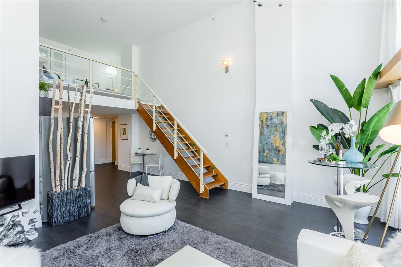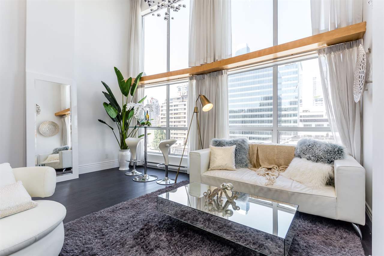 Completely renovated & beautifully designed LOFT in a concrete building in the heart of downtown. This bright & spacious unit features soaring 16' ceilings, floor to ceiling windows, & open city views to the West on the quiet side of building. Soft-close wooden cabinetry in kitchen, quartz counters & backsplash, S/S appliances, gas range, & new flooring. Large insuite storage room, insuite laundry. The building has a rooftop patio w/ panoramic 360 degree views, gym, party room, 3 more patios, BBQ area, live-in caretaker. Central location on edge of Yaletown, steps to shopping, dining, transit. Perfect walk score 100. Professional interior design - option to include furniture & decor. RENTALS & PETS ALLOWED.